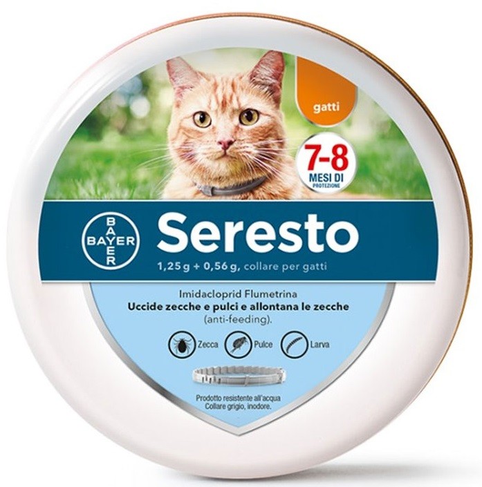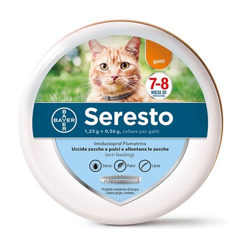 Proteggere il gatto da infestazioni di pulci e zecche è un gioco da "gatti" con Seresto, l'unico collare che offre massima protezione per lunghi periodi.Seresto® è un collare antiparassitario contro pulci e zecche con alcune caratteristiche particolari. Usa una combinazione innovativa di materiali che permette di rilasciare in modo controllato dosi basse dei principi attivi fino a 8 mesi.Ciò offre un'elevata protezione del gatto che non è limitata alla sola uccisione di pulci e zecche, ma agisce anche repellendo le zecche prima che possano pungere, cosa che facilita la protezione dell'animale contro le malattie trasmesse da questi parassiti.Seresto® è resistente all’acqua, la struttura polimerica conserva i principi attivi all’interno del collare. Questo significa che anche se l’animale si bagna o viene lavato non è necessario togliere il collare.Il lavaggio mensile con shampoo o l’immersione in acqua non riducono in maniera significativa l’attività di 8 mesi contro le zecche, l’attività contro le pulci si riduce gradualmente a partire dal quinto mese.Informazioni Tecniche:Lunghezza massima del collare 38 cmSeresto è collare contro pulci e zecche- Può essere indossato insieme al normale collare del gatto ed è regolabile per adattarsi a qualsiasi gattoSistema di sganciamento di sicurezza- Seresto è dotato di un meccanismo di sganciamento che previene il rischio di strangolamentoMatrice polimerica innovativa- Provvede al rilascio controllato e a piccole dosi dei principi attiviConfezione interna (busta contenente il collare)- Protegge i principi attivi di Seresto® fino al suo impiegoFoglietto illustrativo- Comprende tutto ciò che si deve sapere per l’utilizzo di Seresto®Scatola di latta- Riciclabile al 100%Controindicazioni:Non trattare gattini di età inferiore a 10 settimane.Non usare in animali con ipersensibilità nota ai principi attivi o ad uno qualsiasi degli eccipienti.