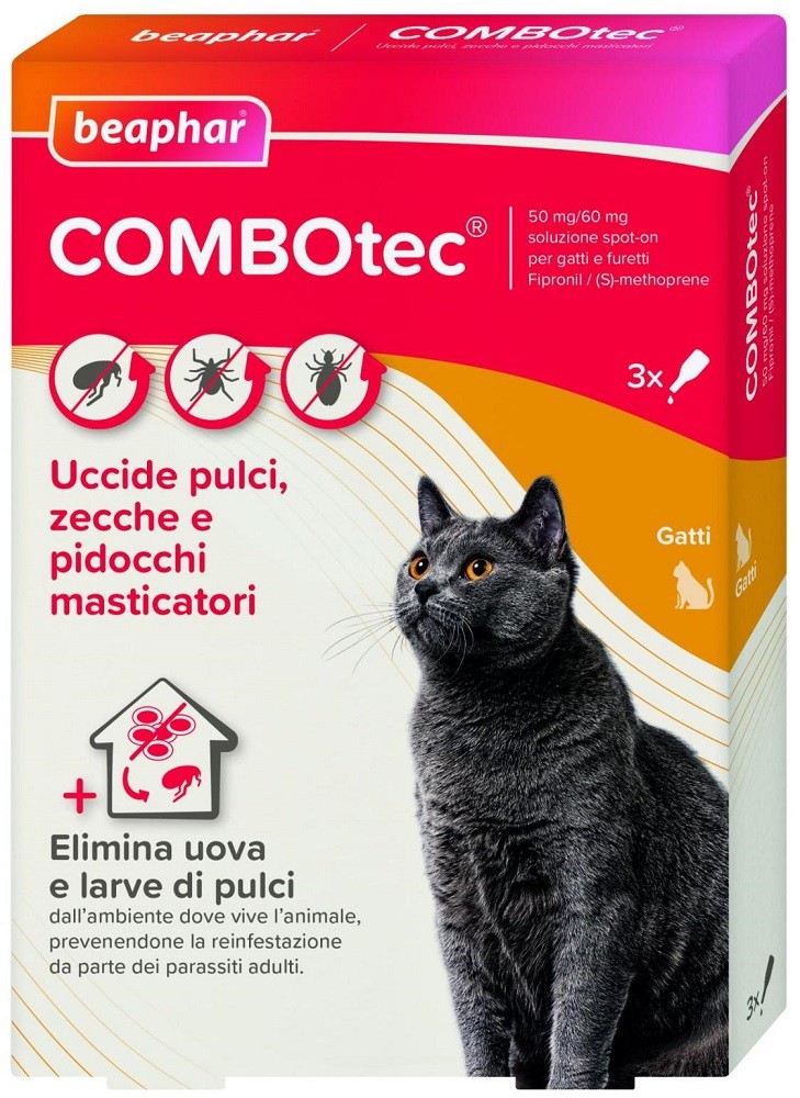 - Uccide le pulci (Ctenocephalides spp.) e protegge da nuove infestazioni in gatti e furetti per 4 settimane- Uccide le zecche (Ixodes ricinus, Dermacentor variabilis, Rhipicephalus sanguineus) e protegge da nuove infestazioni nei gatti per 2 settimane e nei furetti per 4 settimane- Uccide i pidocchi masticatori (Felicola subrostratus) nei gatti- Inibisce lo sviluppo di uova, larve e pupe delle pulci (per 6 settimane nei gatti) e nello stesso periodo previene infestazioni dell’ambiente dell’animale trattato da parte di pulci nei primi stadi di sviluppo- Il prodotto può essere utilizzato come parte di una strategia di trattamento per il controllo della dermatite allergica da pulci (DAP) nei gatti.