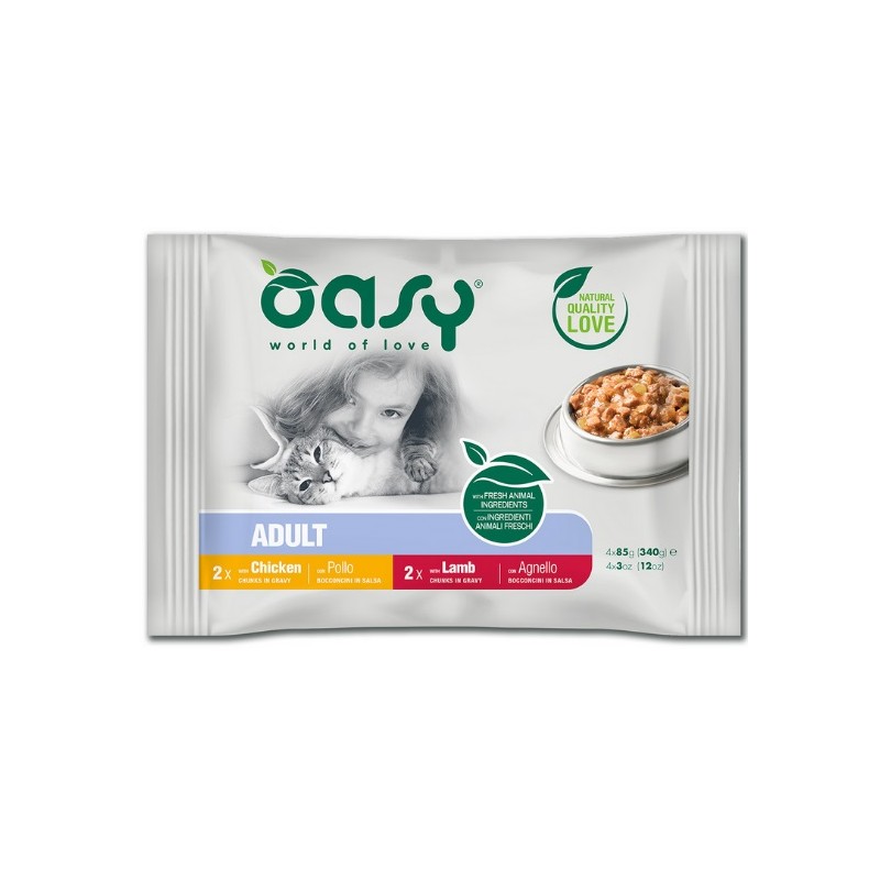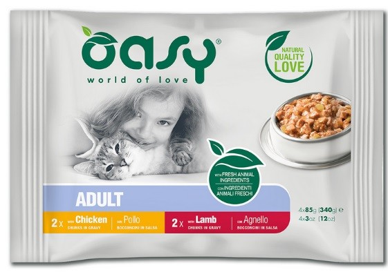 Oasy Multipack Adult Bocconcini in salsa 4 x 85 gr sono alimenti completi formulati con carne fresca e con ingredienti naturali per garantire il massimo del gusto e soddisfare le esigenze specifiche del gatto adulto in base al suo stile di vita.