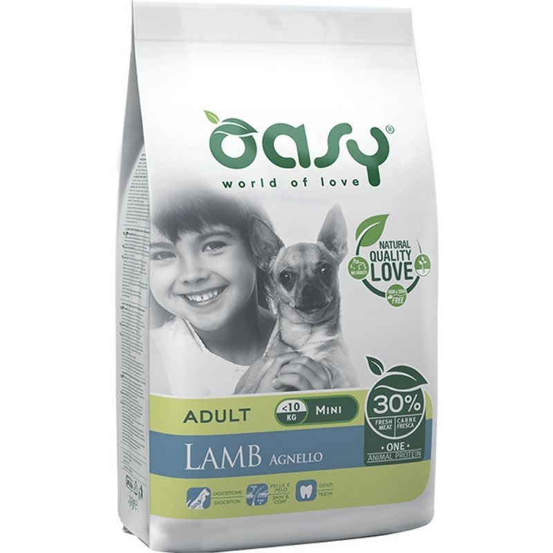 Le crocchette per cani Oasy One Animal Protein Adult Small/Mini Agnello sono l'ideale per tutte le razze di taglia mini e small con intolleranze alimentari, sensibilità intestinale e cutanea.Realizzate con un'unica proteina di origine animale rappresentata dall'Agnello (48% in totale, di cui 30% fresco, 15% disidratato e 3% idrolizzato) e riso altamente digeribile, possono essere utili nelle diete ad esclusione.Benefici:DIGESTIONEL’Inulina è una fonte di prebiotici FOS (fruttoligosaccaridi) che con i MOS (mannanoligosaccaridi) favorisce un corretto equilibrio della flora batterica intestinale. L’estratto di yucca è indicato nel controllo dell’odore delle feci. La polpa di barbabietola è un’ottima fonte di fibre e supporta una regolare attività intestinale.PELLE E PELOL’apporto bilanciato di acidi grassi Omega-6 e -3 favorisce una pelle sana e un mantello folto e brillante. Gli acidi grassi Omega-6 e -3 sono nutrienti importanti per la rigenerazione del pelo e l’integrità della pelle del cane. DENTIUn corretto apporto di Calcio e Fosforo, insieme all’azione pulente data dalla particolare consistenza delle crocchette, favorisce la salute di denti e gengive.ALIMENTO COMPLETO PER CANI DI TAGLIA PICCOLA DI UN ANNO O PIU'COMPOSIZIONE: carne fresca di agnello 30%, riso, agnello disidratato 15%, proteina di riso, grasso animale, fegato di agnello idrolizzato 3%, semi di lino, polpa di barbabietola 1,5%, proteina di patate, lievito di birra 1%, sostanze minerali, olio di pesce, inulina 1.000 mg/kg (fonte di fruttoligosaccaridi), zenzero 0,1%, mannanoligosaccaridi 1.000 mg/kg, Yucca schidigera 170 mg/kg.COMPONENTI ANALITICI: proteina grezza 28%, grassi grezzi 17%, acidi grassi Omega-6 2,55%, acidi grassi Omega-3 0,35%, EPA + DHA 450 mg/kg, fibre grezze 2,8%, ceneri grezze 7%, calcio 1,35%, fosforo 1,05%, umidità 9%.ADDITIVI: ADDITIVI NUTRIZIONALI: Vitamina A 20.000 IU/kg, Vitamina D3 2.000 IU/kg, Vitamina E 300 mg/kg, Vitamina C 100 mg/kg, ferro (solfato di ferro (II) monoidrato) 68 mg/kg, iodio (ioduro di potassio) 3,2 mg/kg, rame (solfato di rame(II) pentaidrato) 9 mg/kg, manganese (solfato manganoso, monoidrato) 6,8 mg/kg, zinco (ossido di zinco) 108 mg/kg, selenio (selenito di sodio) 0,11 mg/kg.ADDITIVI TECNOLOGICI: antiossidanti.SENZA AROMATIZZANTI O COLORANTI ARTIFICIALI AGGIUNTI.
