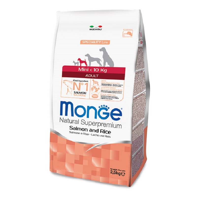 Le crocchette Monge Natural Superpremium Speciality Line Mini Adult con Salmone e Riso sono un alimento completo per cani di piccola taglia.