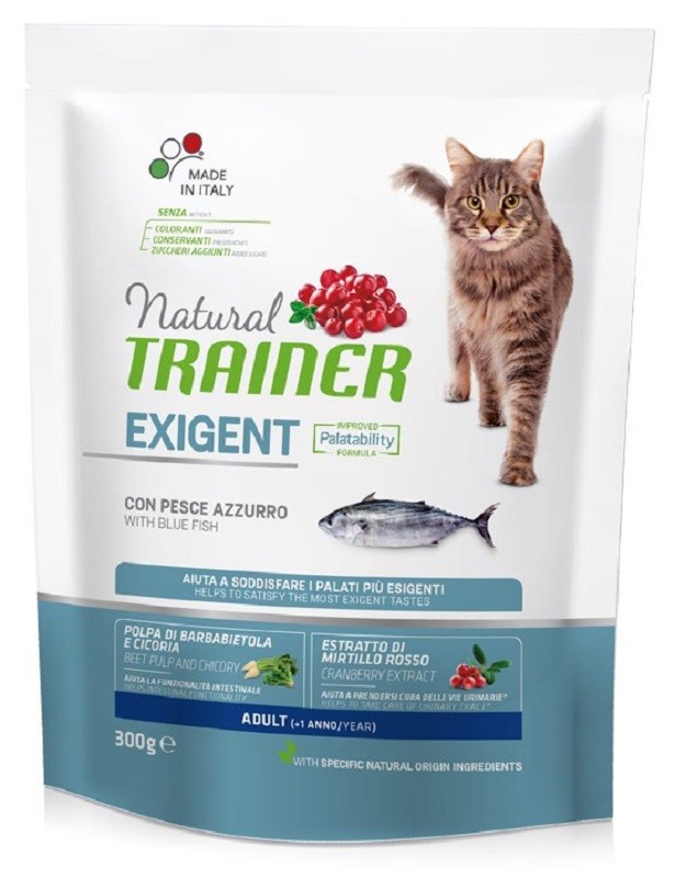 mirtilli rossiAiuta a preservare il benessere del tratto urinario grazie al Mirtillo rosso ed al contenuto apporto di Magnesio e Fosforo Trainer® Natural Exigent è una linea di alimenti per gatti, non testata su animali, che conquista il suo gusto capriccioso!Come fanno gli alimenti Exigent ad essere così irresistibili?+ 15% DI CARNE FRESCA! Sono alimenti bilanciati e completi, con una formulazione che conquista ancor di più il vero carnivoro: + 15% di carne fresca!TONDO È MEGLIO Lo sapevi che la forma tonda della crocchetta aiuta ad aumentare la digeribilità? Inoltre la sua composizione granulosa e il suo profumo la rendono... irresistibile per il tuo gattoNO SCHIFEZZE! I prodotti Natural Exigent Cat, così come quelli Natural, sono privi di coloranti, conservanti e appetizzanti artificiali... e il tuo gatto lo sente quando un alimento è Naturale!Confezione 300 gr