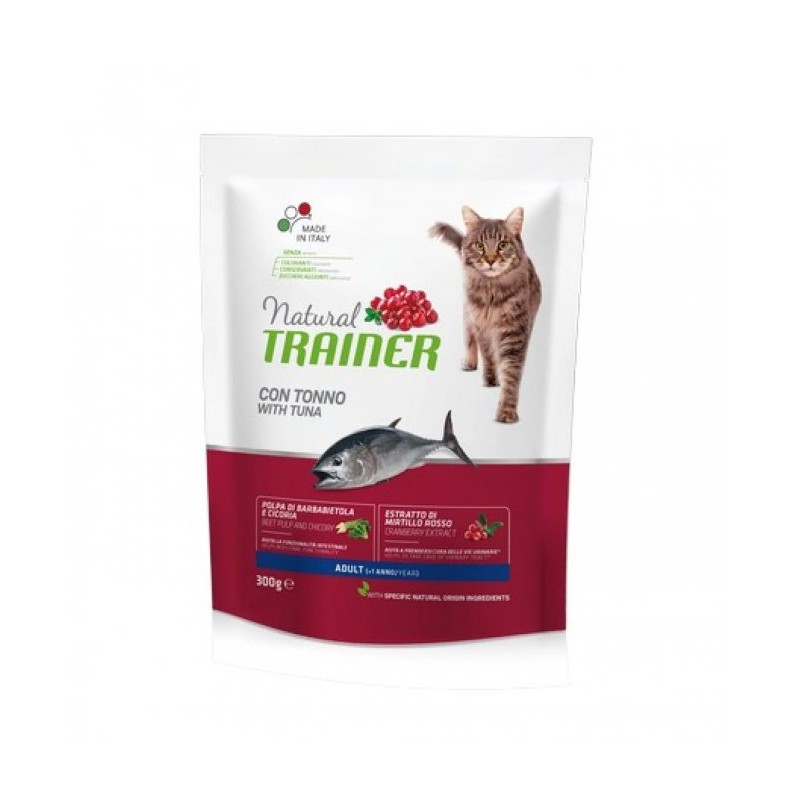 Natural Trainer Adult, prodotto con tonno e ingredienti funzionali come la mentuccia o il mirtillo rosso, è la fonte di energia di cui il vostro gatto adulto ha bisogno ogni giorno.