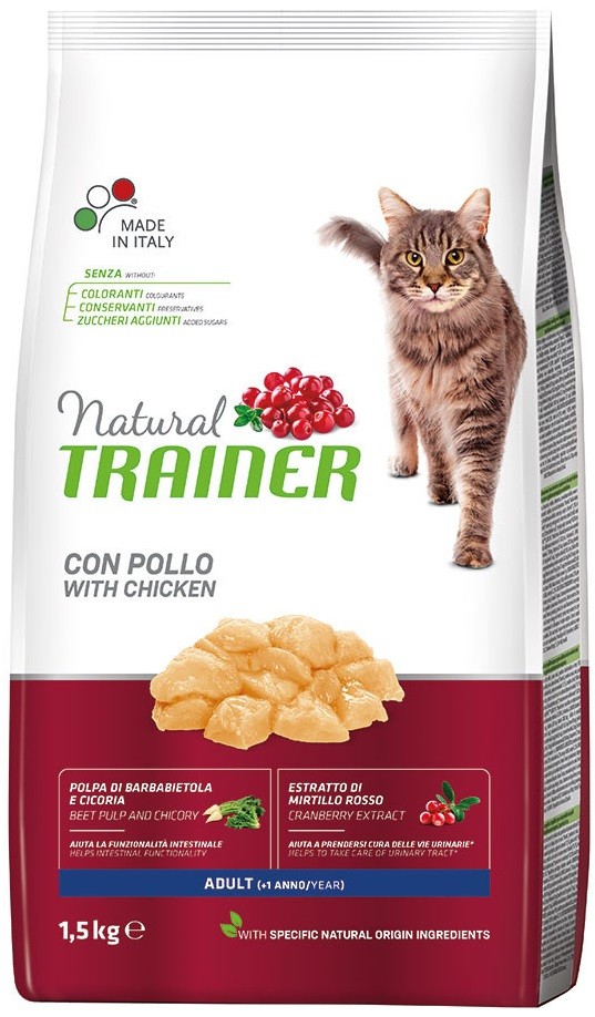 Stanco dei soliti croccantini? Il tuo micio ha bisogno di un alimento completo che soddisfi al 100 % il suo palato, donandogli vitalità, favorendo il benessere della cute, dell'apparato urinario e dell'alito.Con Trainer cat Natural gli doni il benessere completo.