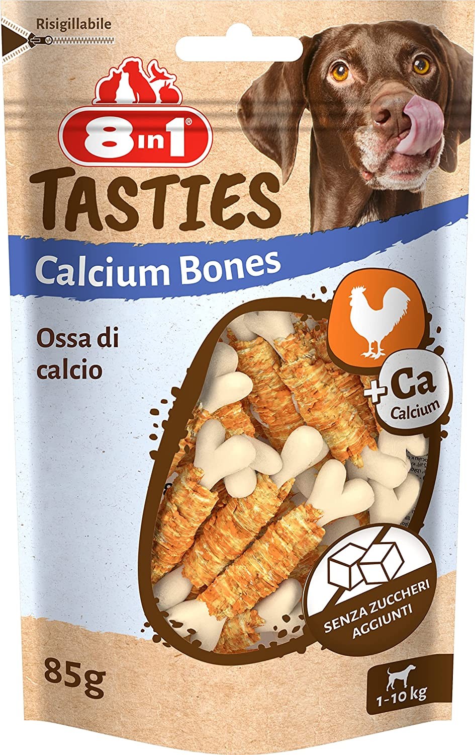 Gli 8in1 Tasties Calcium Bones sono degli snack ricompensa che il tuo cane amerà. Sono a base di delizioso petto di pollo avvolto ad un osso di calcio. Queste prelibatezze saporite e salutari sono snack per cani ideali un pasto e l'altro. Sono snack ricchi di petto di pollo e di proteine. Le proteine favoriscono una massa muscolare magra per una forma fisica ottimale. Gli 8in1 Calcium Bones sono facilmente digeribili, senza zuccheri aggiunti e a basso tenore di grassi. Sono formulati senza aromatizzanti, OGM, conservanti artificiali e coloranti. Gli 8in1 Tasties Calcium Bones sono uno snack ideale per cani di taglia toy e piccola. Lascia che il tuo cane si goda i nostri gustosi Calcium Bones.
