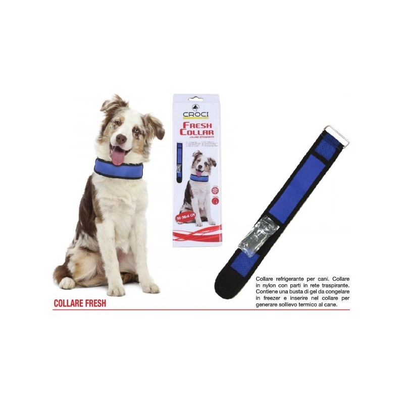 Collare refrigerante per cani in nylon e rete traspirante. Contiene una busta di gel da congelare in freezer e inserire nel collare per generare sollievo termico al cane.