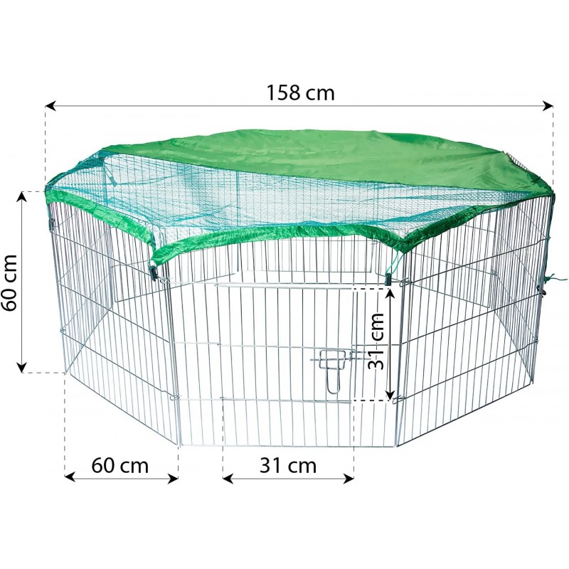 Caratteristiche: Diverse forme di costruzione possibili (ottagono, rettangolo, quadrato) Dimensioni ottagono: Ø 158 cm ca. Dimensioni rettangolo (lunghezza x larghezza): 120 x 60 cm ca. Dimensioni quadrato (lunghezza x larghezza): 120 x 120 cm ca Dimensione di ciascun elemento della griglia (lunghezza x larghezza): 61 x 61 cm (Totale 8 pezzi) Spessore della struttura in acciaio: 3,2mm Dimensioni porta (lunghezza x larghezza): 31 x 31 cm circa. Peso netto 8,9kg.
