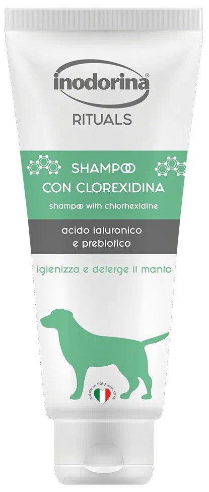 Pelo pulito? Manto igienizzato? Delicato profumo? Tutto questo si può! Con la nuova linea degli Shampoo Inodorina detergerai il manto del tuo animale senza rovinargli la cute.Lo Shampoo Rituals con Clorexidina è un prodotto igienizzante e pulente con formula bilanciata per tutti i tipi di pelo. La presenza di glicerina dona luminosità, vitalità e protezione al manto del tuo cane. Contiene clorexidina, acido ialuronico e prebiotico igienizza e deterge il manto.Confezione da 250 ml