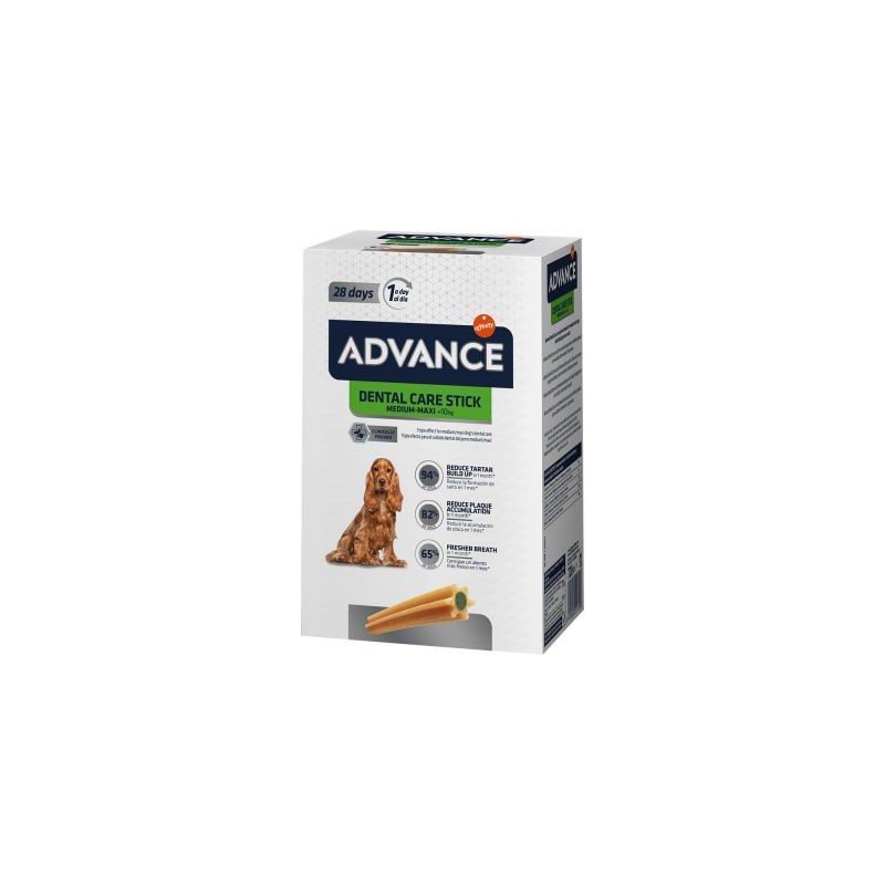Gli snack Advance Dental Medium Stick per cani sono la soluzione ideale per migliorare l'igiene dentale e orale: grazie alla loro speciale forma, all'esclusiva formula dall'effetto batterio-statico e pirofosfato, possono combattere le cause della placca e dell'alito cattivo in modo diretto.- Sono l'ideale per cani di taglia media con un peso da 10 – 45 kg e possono essere inseriti come integrazione alla normale alimentazione giornaliera.